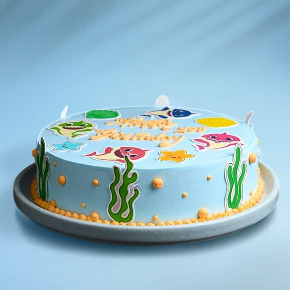 Jump into a sea of fun with our Baby Shark theme cake! This vibrant cake is perfect for any joyous celebration, featuring a cheerful shark, colorful starfish, and ocean-themed decor.