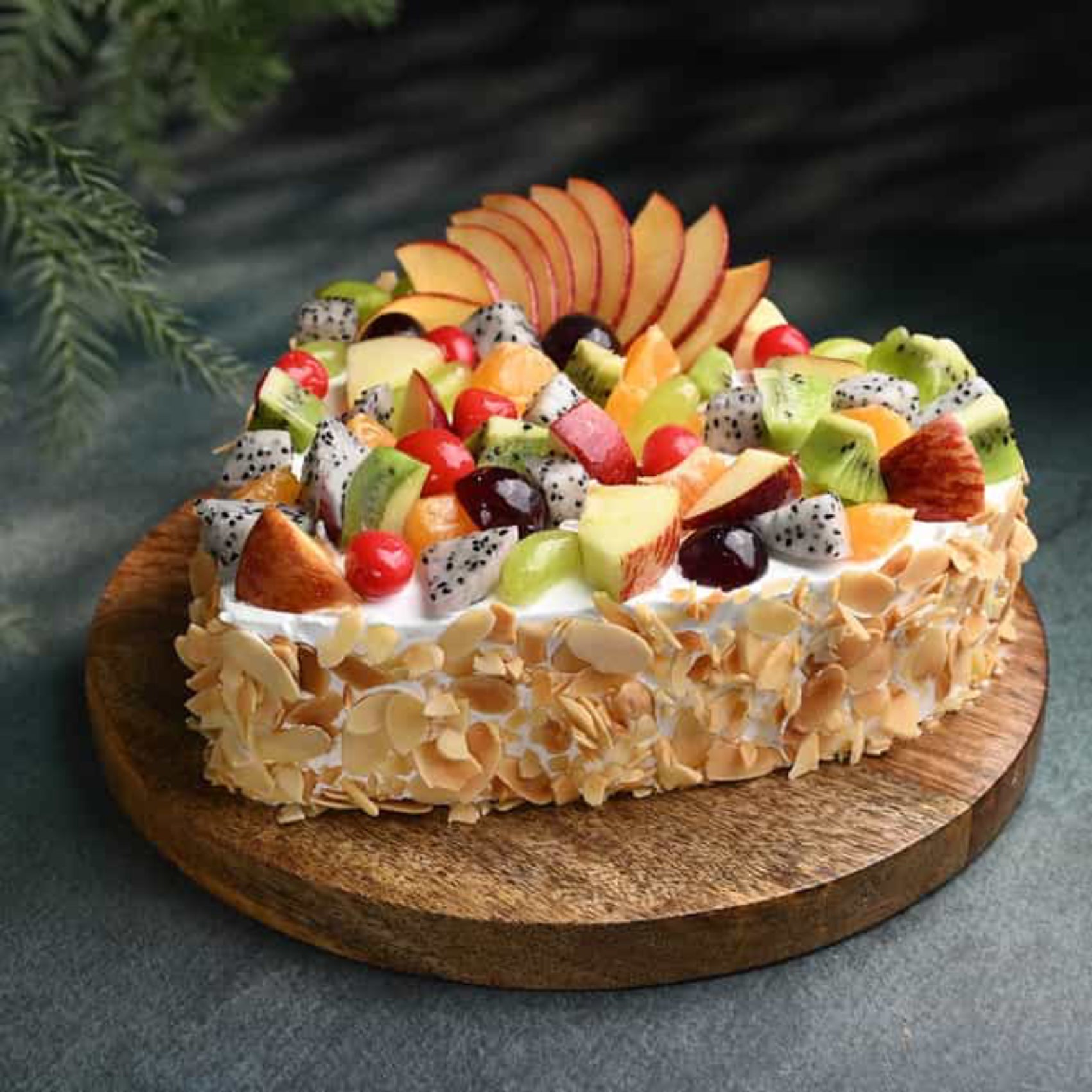 Garnished with fresh assortment of tropical fruits, this vanilla cake is coated with handfolded cream & crushed almonds.